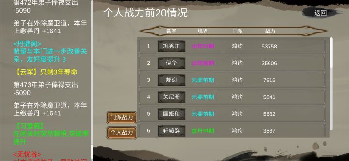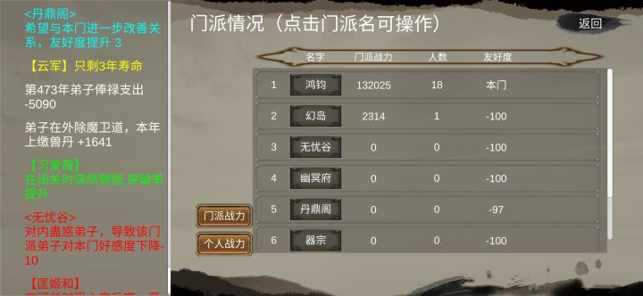 忽然灵光一闪想出来的玩法,感觉可行性非常大。首先从二五仔这个特性出发,我被搞没一个弟子,加入其他门派后又来诽谤我。而如果我用灵石挖人挖的多了,即便送礼也经常会有门派过来挑事。与其去规避,倒不如主动出击。由此已经得到了两个主要信息,一是弟子与与弟子间的好感,一是弟子与门派之间的好感。思路很简单,准备好初始阶段的弟子,掌门慈眉善目特性最好,没有也无所谓。第一步先把弟子的仇人活活熬死,提高好感后慢慢生
