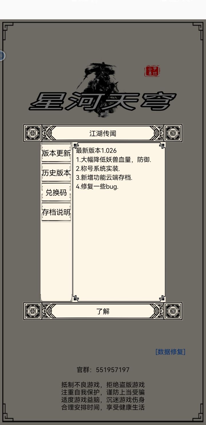 有个问题,由于这游戏tapplay不能更新,所以只能看见更新信息后,先上传云端存档,然后卸载游戏,再下载新版本。现在的问题是,下载新版本之后,再下载存档-再续前缘,提示少侠未在江湖留下足迹,所以存档的问题还是没解决,这个问题,希望尽快解决。如果看到,请回复一下