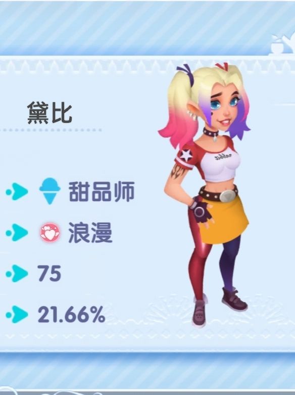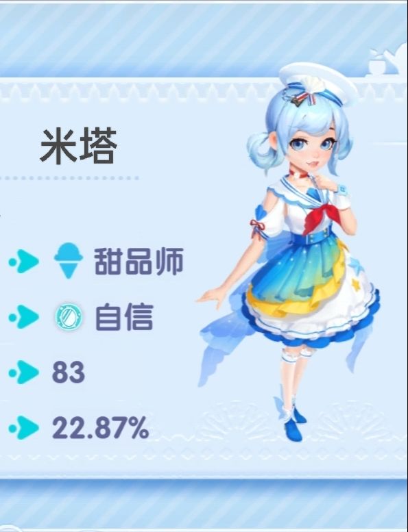 4.10日新增帕尼娅不知不觉,连83的超高基础大佬都已经有10个了呢,真的是,现在开始游戏,80以下完全是没什么活路了呢钻技能:1钻 星愿涌现(房间内所有自信和体贴员工厨艺+6%)2钻 冰雾打发(房间内所有甜品师厨艺+6%)冠技能:(需在雇员档案中进行激活)1冠 甜品导师米塔(所有甜品师厨艺+4%)3冠 自信导师米塔(所有自信员工厨艺+5%)自信体贴体系的重要桥梁,双性格的米塔对双