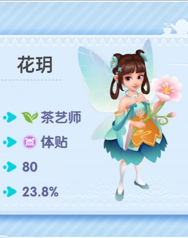 从这里开始都是推荐重点培养的各性格职业大佬了1、80 花玥&丽雅钻技能:1钻 食神真传(房间内所有员工厨艺+4%)2钻 后厨指南(自身厨艺属性+15%)冠技能:(需在雇员档案中进行激活)1冠 茶艺导师花玥(所有茶艺师厨艺+4%)3冠 体贴导师花玥(所有体贴员工厨艺+5%)花玥是目前高阶体贴必选雇员,因为是唯一一个拥有后厨指南的体贴雇员,在其他体贴加成具备的情况下,花玥的厨艺是真的会