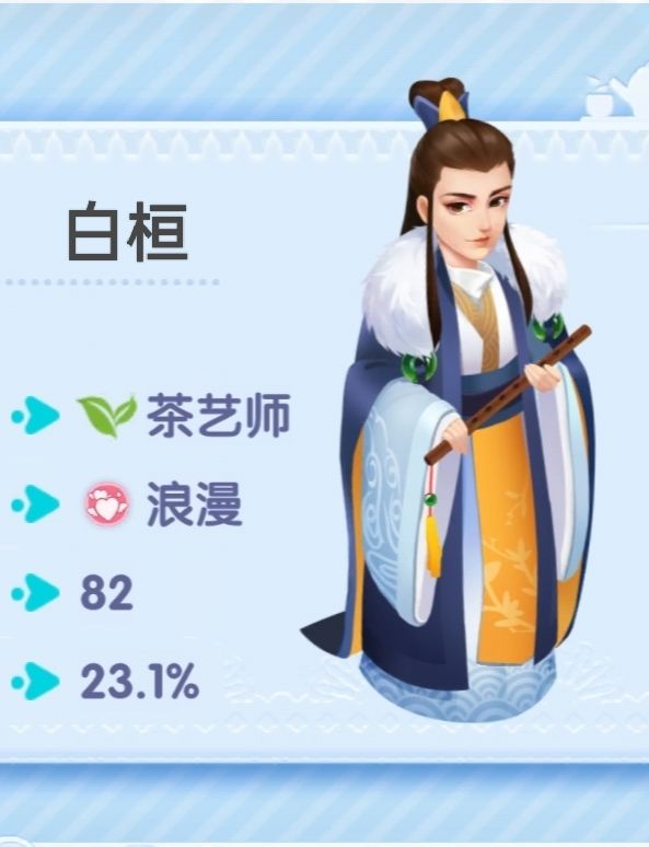 全员高基础,但是居然都排不到前十?!现在的竞争,这么激烈的嘛……钻技能:1钻 香氛弥漫(房间内所有浪漫员工厨艺+6%)2钻 食神真传(房间内所有员工厨艺+4%)冠技能:(需在雇员档案中进行激活)1冠 茶艺导师白桓(所有茶艺师厨艺+4%)3冠 浪漫导师白桓(所有浪漫员工厨艺+5%)话说浪漫大佬就是多,可惜因为小天使站队太早,再加上早期浪漫除了碧碧这个氪金巨户之外特别拉胯,于是没有养,