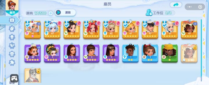 建议刚玩的,或者玩了建议刚玩的,或者玩了好久的,抽员工的时候,真的需要存着扭蛋币,存着十抽,来几个十抽,出金真的很快,刚开始我玩的时候不知道,直到自己发现一次性十抽,三四次抽了四个金,刚玩的姐妹也是,出了金的员工一定不要给她升级用了。我第一次玩的时候不知道要升员工要用同人物升,以为是多出来的,就直接拿去升级其他员工了。直到后面发现真的后悔死了