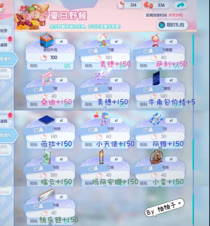 UID 257255关于今日开启的配餐活动,统计了一下活动道具的获取和兑换,宝子们往下看~有需要可以自取图~1.在配餐活动期间,在野餐谢礼可以使用徽章兑换返场家具(8月19日开启)。这次配餐活动返场的家具全部是主题家具里的贵重物家具,主要有三套,分别是:(1)️粉色Ins风「甜蜜糖果」-桃红字体️(2)蓝色星空「天空幻想」-深蓝字体️(3)中国风「烟柳画桥」-墨绿字体📌大家如果从
