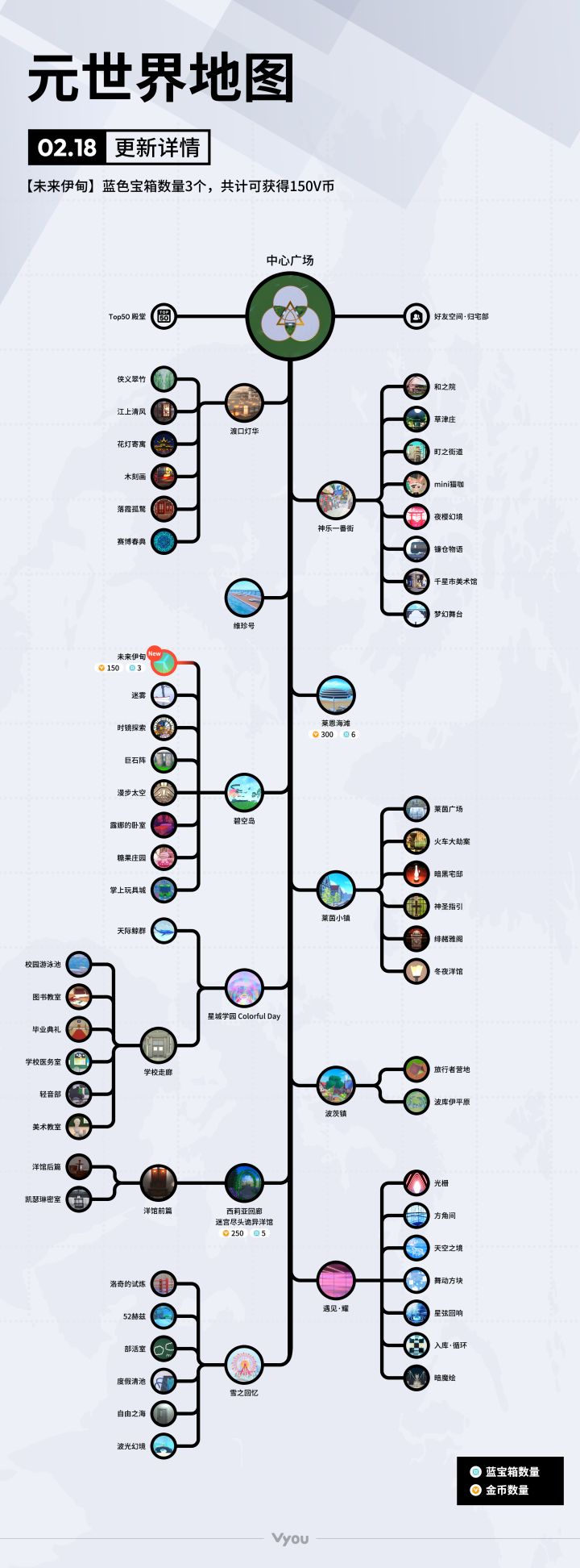 本周的更新预告姗姗来迟啦!在科技风满满的未来伊甸庭院中,会有怎么样的穿搭等着你呢?化身使命必达的“五星好评”,或者是辛勤敬业的“消菌卫士”?快来了解本周更新的内容吧~同时,为了让大家能更好的游玩元世界并获取宝箱奖励,在本周五资源更新后,我们将对宝箱系统作出如下改动:一、元世界宝箱总数调整元世界宝箱总量由原来的30个减少为14个,同时单个宝箱内V币的数量由20增加到50。元世界可获取的V币总