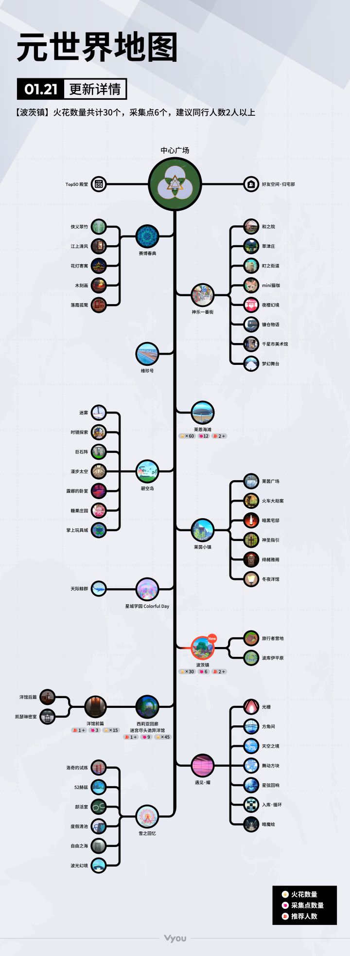 小V速报:1月21日,元世界地图又更新啦!⭐ 新增幻想主题地图“波茨镇”,上线元世界及自由拍摄地图的布局、火花、采集点的数量,以及相应的推荐游玩人数也同步更新。请有需要的小伙伴注意查收!
