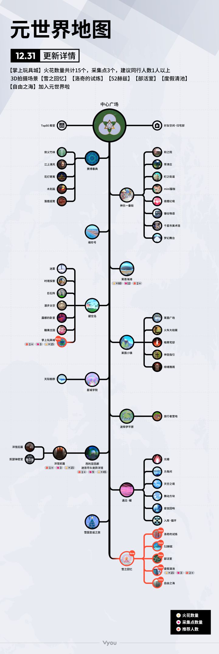 小v为大家带来12月31日最新版的元世界地图一张!⭐“掌上玩具城”场景上线元世界及自由拍摄模式;⭐“雪之回忆”主题系列现代场景上线元世界;⭐“天空之境”地图上线自由拍摄模式。地图的布局,火花、采集点的数量,以及相应的推荐游玩人数也同步更新。请有需要的小伙伴注意查收!