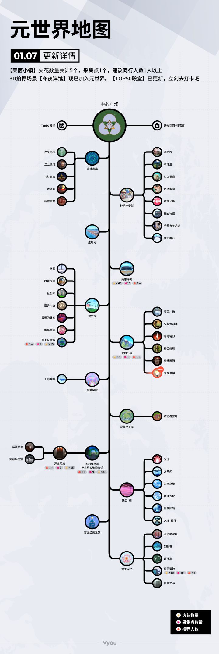 小v为大家带来1月7日最新版的元世界地图一张!⭐ 新增了欧式场景“冬夜洋馆”,同步上架元世界及自由拍摄⭐ 元世界大厅的“Top50殿堂”作品更新地图的布局,火花、采集点的数量,以及相应的推荐游玩人数也同步更新。请有需要的小伙伴注意查收!