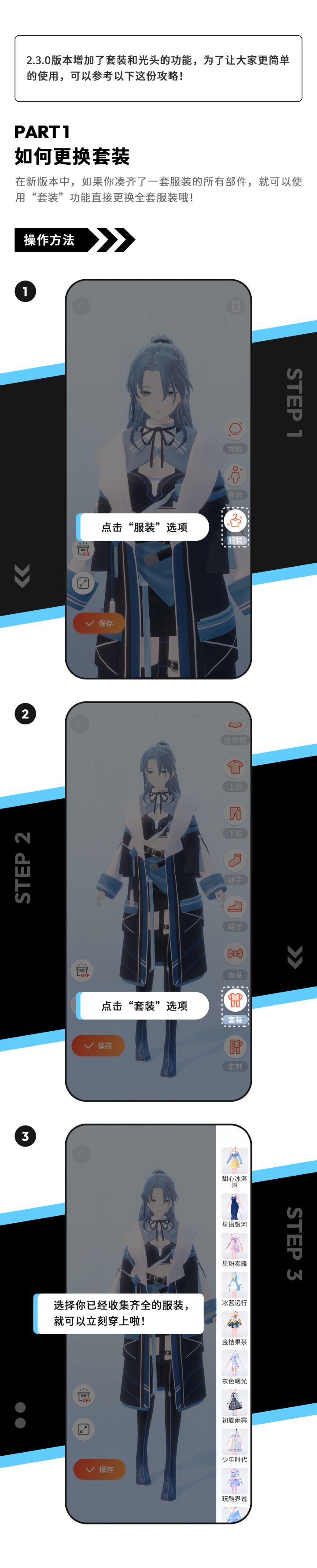 今天2.3.1版本已经正式全线升级啦!不知道大家有没有去体验呢?本次更新增加了套装更换、套装定制、光头以及自由拍摄的好友邀请功能,为了让大家快速了解新功能的使用方法,我们制作了这份攻略,希望可以帮助大家快速入门,抓紧学起来吧!