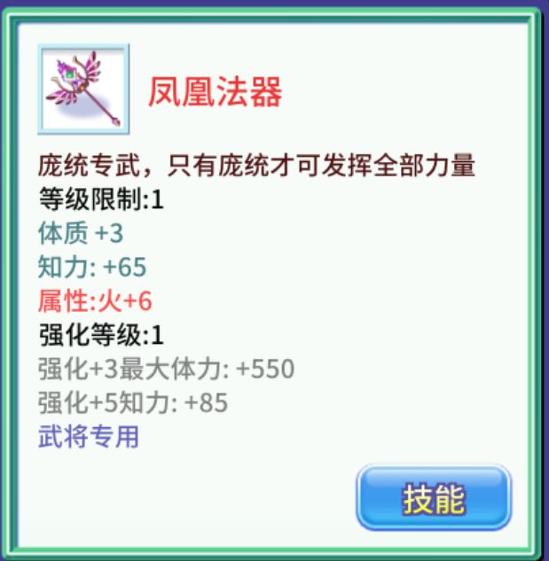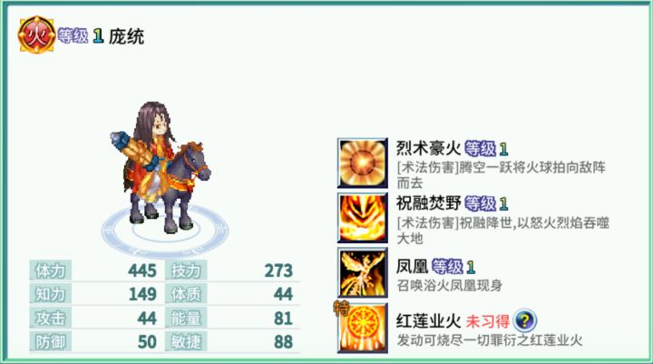 【图1】再看一下庞统的二转技能,全是顶流技能。吞食这款游戏,技能是很重要的。就算你的属性再高,乱击和崩雷也是天壤之别。所以,武将技能是很重要的。而庞统作为四军师之一,相对土豪氪金神将,也是很实用,普通玩家也是可以通过时间培养起来的。