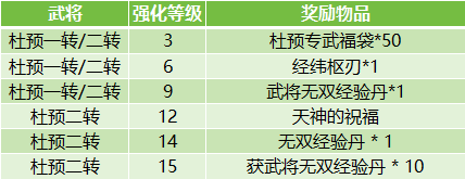 1. 新年登录拿豪礼【领取时间】2026/1/1 维护后 ~ 2026/1/1 23:59专武自选卷*1元宝*666 2. 武将升星活动为回馈各位玩家的厚爱,助力大家在三国冒险之旅中披荆斩棘,我们特别推出 **“升星计划” 活动 **,海量福利助力战力飙升,快来一探究竟! ①杜预强化活动(新区专属) 【活动时间】 2026年1月1日 维护后 ~ 2026年1月14日23:5