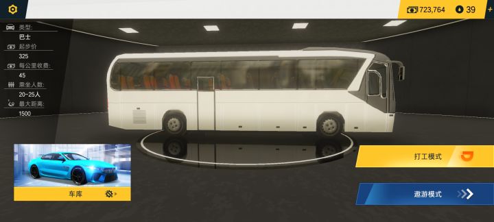 4、此时你已经有3辆车了,按照前三个步骤,一般只需要一小时。跑几单凑够1w块,选遨游模式。进入游戏后不要相信1000km一个金币。这游戏bug之一就是遨游模式实际1km1金币。跑个1000km实际获得1000币,把车和场景买完绰绰有余。