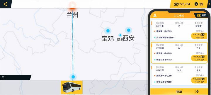 3、解锁两个场景后,选如图二所示的单。不要被屏幕显示的吓到了,其实这一单实际内容是两点一线的,而且离得很近,不会花太多时间,钱也多。此时就走钞票路线,看广告,运气好只需要三次单,三次广告,就有新车了。