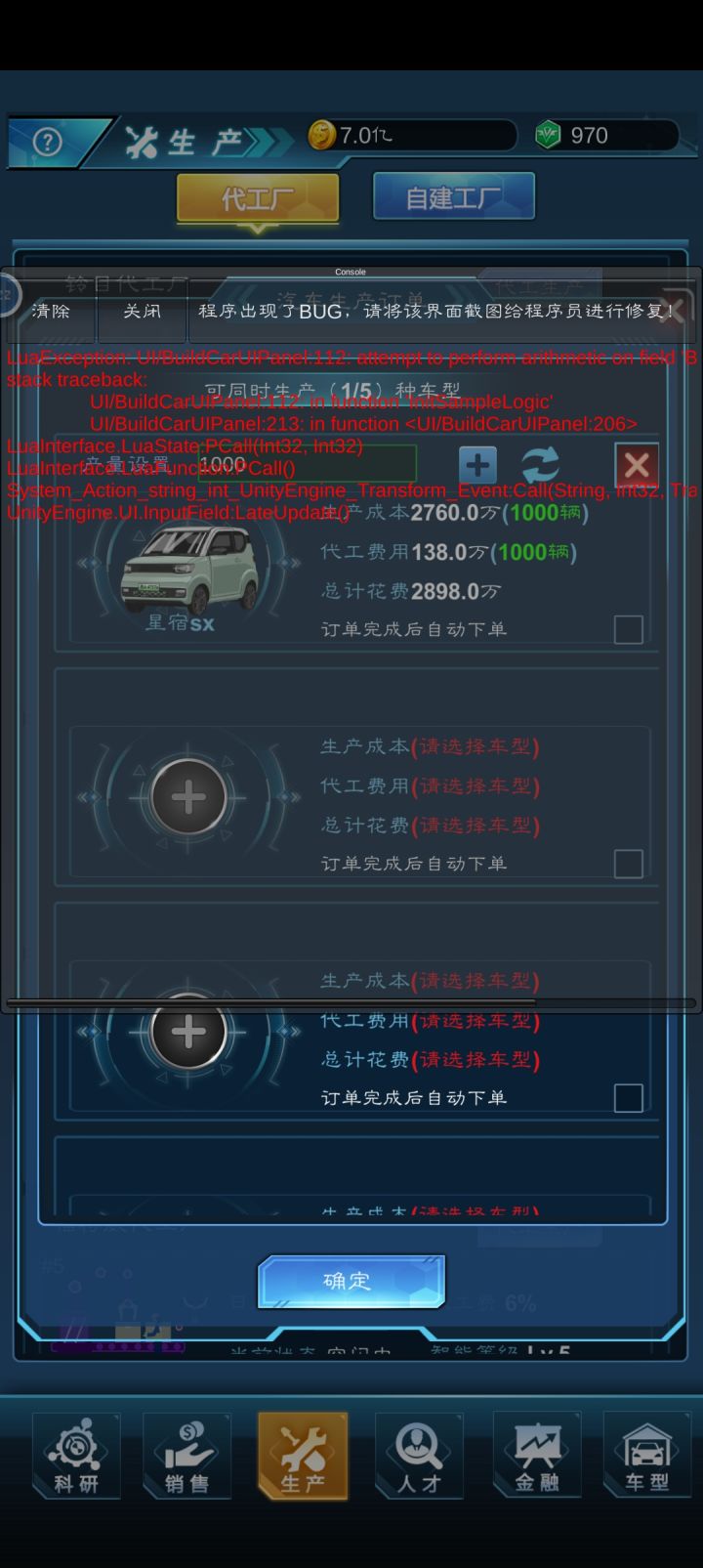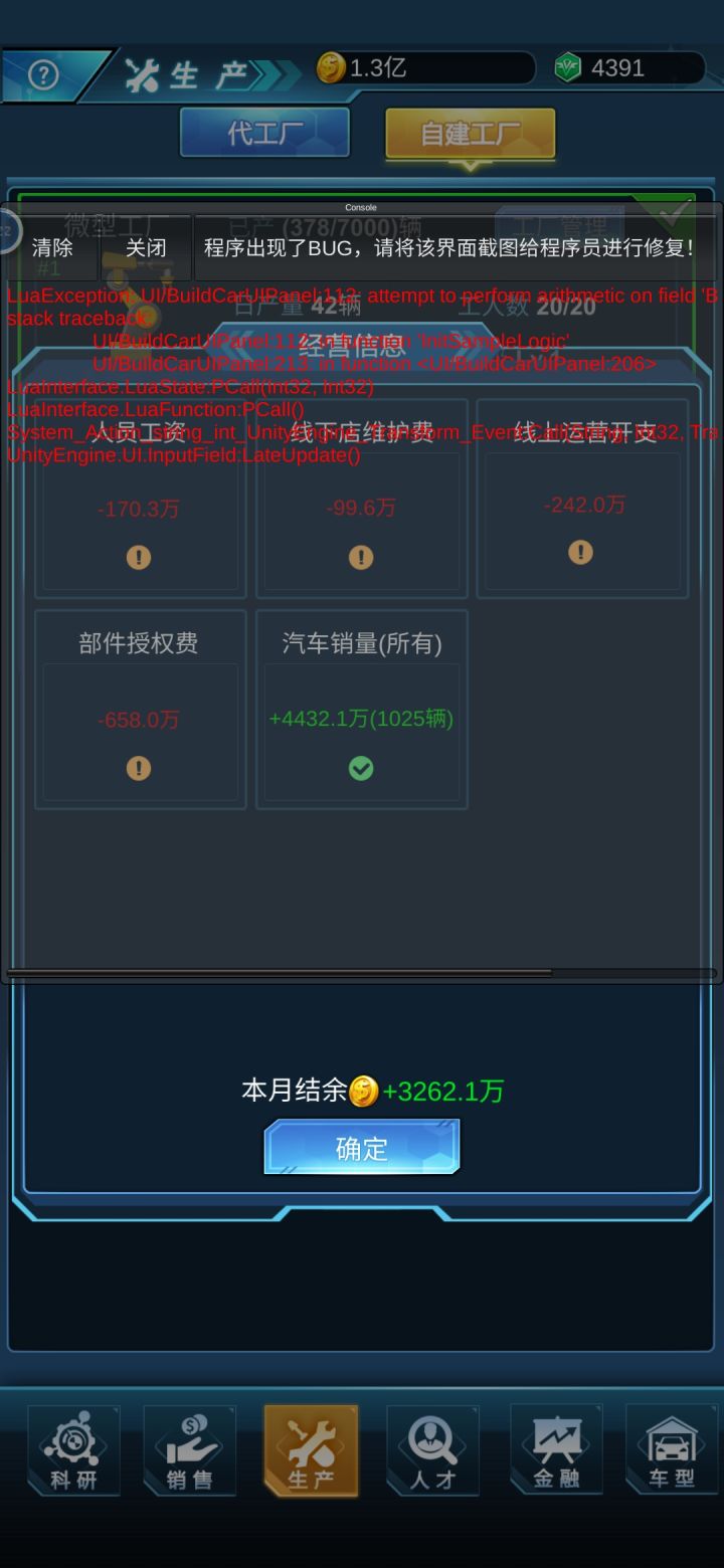 字体冲突出错误。 研发手动点选研发人员没法进行下一步 。工厂操作太不友好了,工厂多了设定生产麻烦的一批,最好有个批量操作。工厂没更新前是自动生产难停止,要点好多下,然后完成未生产的订单后停止, 有时会出现自动进入批量生产。更新后倒是好点了,可是停止后,自动进入生产状态还是没有解决。有时一点停止就是一列工厂都停止,然后又苦逼的继续重新设置生产开工。工人年龄也没有列表可以看到有哪些要超龄退休,只能不断地看广告用钻石刷年龄。