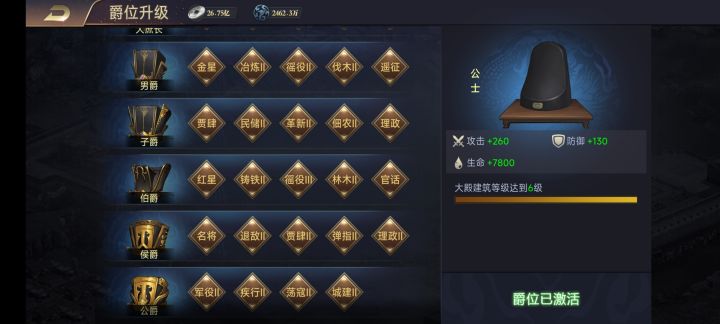 爵位在游戏中的地位很重要,是提升战斗力的重要环节,所以优先提升爵位。爵位的提升也是激活各项功能的重要部分。