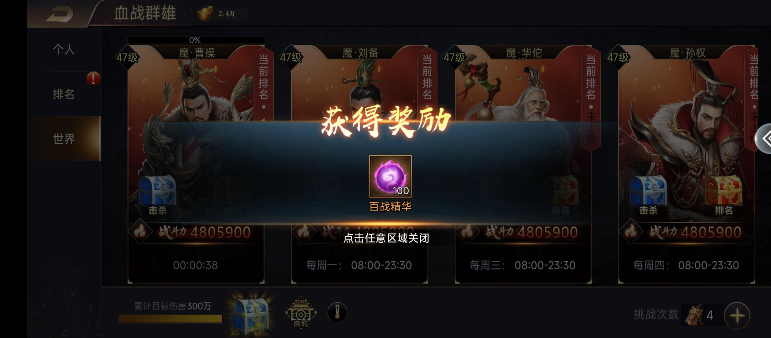 132 笑傲江湖2023.01.31签到打卡世界BOSS打到一定伤害可以领大量百战精华。