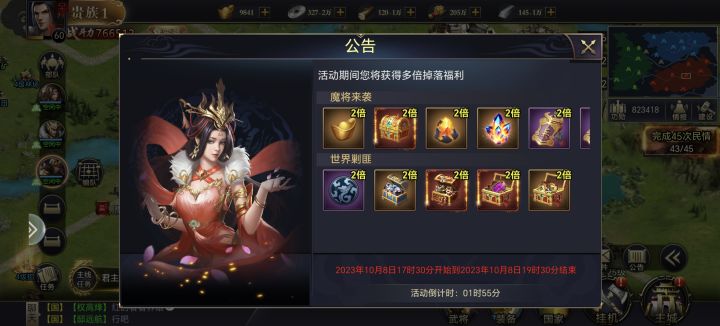 下午17:30~19:30,魔将来袭和世界剿匪奖励翻倍,加速兵种升阶。
