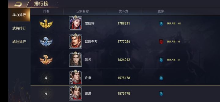 有些主公还不太清楚国家模块的国家仓库税收和分配规则,今天为大家介绍一下一、国家仓库1、本国占领城池每天晚上10:00会产生国家税收,填充到国家仓库;2、部分高级城池可产生黄金税收;3、本国玩家购买元宝和礼包,也会获得一份国家奖励填充到国家仓库;4、国家仓库每周一00:00时向本国玩家分配上一周的国库资源;5、本国玩家个人周功勋占国家本周功勋比例越高,奖励越多,周功勋不低于150000可