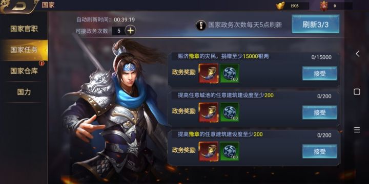 国家任务每日免费获取5次,可以通过元宝购买次数。奖励根据任务完成度发放,评价越高完成度越高,奖励越多。拉满后奖励为:号角*1,高级资源宝箱*1,中级资源宝箱*1,初级资源宝箱*3,功勋*840。号角数量不会随完成度增多,功勋会,资源箱会由刚完成时的初级资源箱,慢慢加到中级、高级。任务主要为以下四种:①赈济灾民:建议只做木材铁矿,捐满30W,奖励给的拉满。②建设城池:一次性领取2个,例如提成