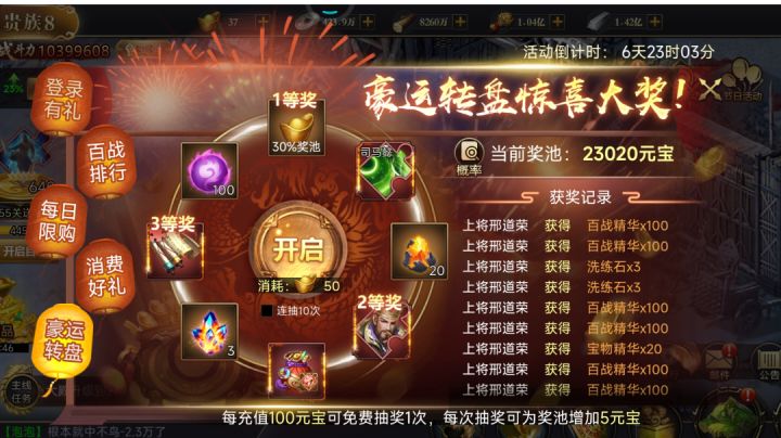 这游戏太牛了。百分之六的中奖率!就是1000次中6次对吧?我们最少抽了1300次,一次都不中。今晚刚出的活动。这中奖率不是扯淡吗?我们合起来丢了应该有6-7万元宝一次未中。