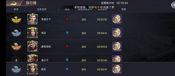 如何轻松完成国战任务有诀窍国战有守城和攻城两项任务,完成后有比较丰厚的奖励。但要同时完成两项任务,就算我方战力明显占优,也比较有难度,这里可以用一个有效的小技巧:在任务当天中午,故意将靠近己方的一个王城让出来给敌方占领,这样,晚上攻城任务大概率就是这个城由于靠近己方,完成攻城任务的概率大大提升。懂的给赞,谢谢