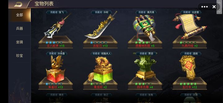 在游戏进行到一定阶段,随大殿等级和人物等级的提升会解锁藏宝阁,通过藏宝阁可以获得大量的战力属性加成,下面介绍藏宝阁的各项玩法。每个红色武将(资质100以上)都有自己的专属宝物,在系统分类中的兵器坐骑珍宝并无什么差别,对提升战力来说都一样,只是需要注意最好给武将配上专属宝物,有专属属性加成。高资质武将的专属宝物相对来说更难获取,可以先给同兵种的武将宝物凑合着用用,比如孙权先用用孙坚的古锭刀,同属刀