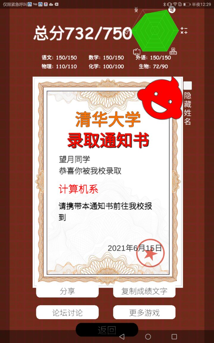 我在<我的高考>得了730分 考上了清华大学 计算机系 你也来玩吧 https://www.taptap.com/app/217114