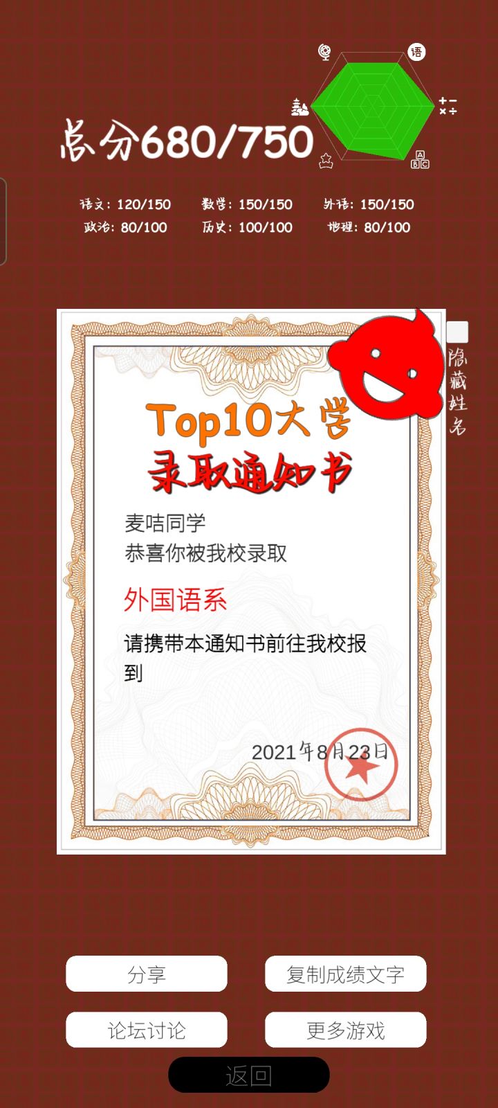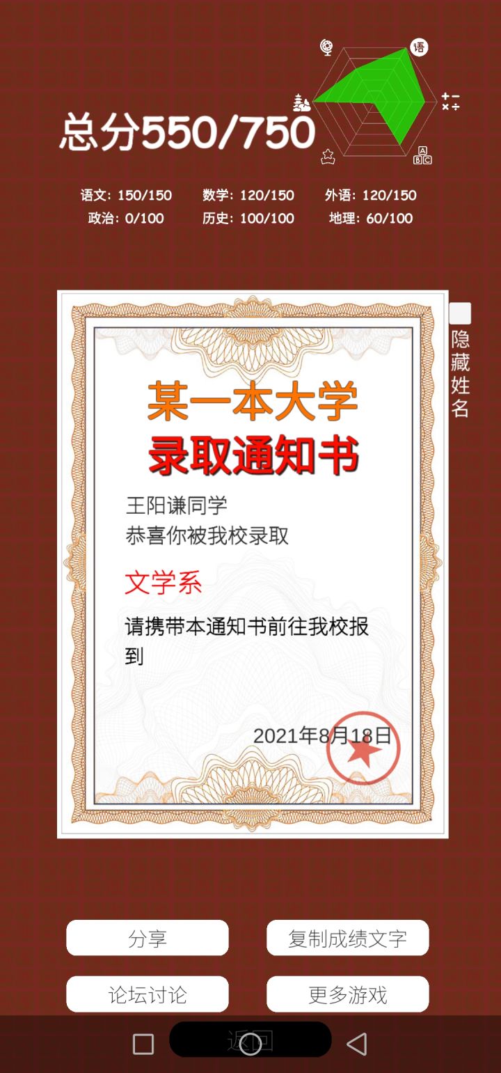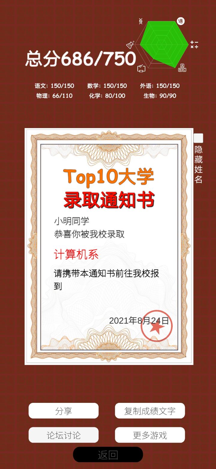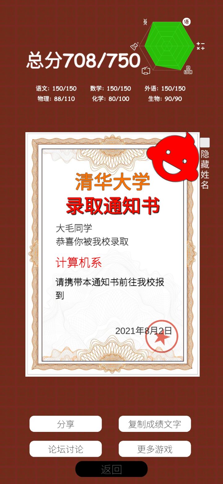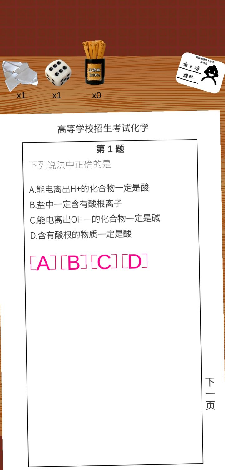 今年高考完,回来玩这个,不能选科,我一个物生地的被迫写了化学。果不其然,化学0分,其他都是满分,好家伙⊙▽⊙如果能像新高考一样选科就好了呜呜呜