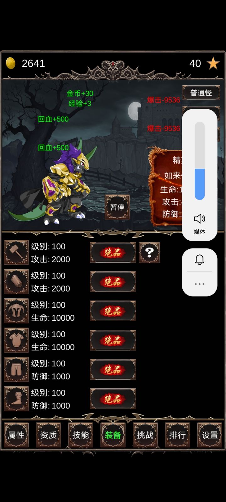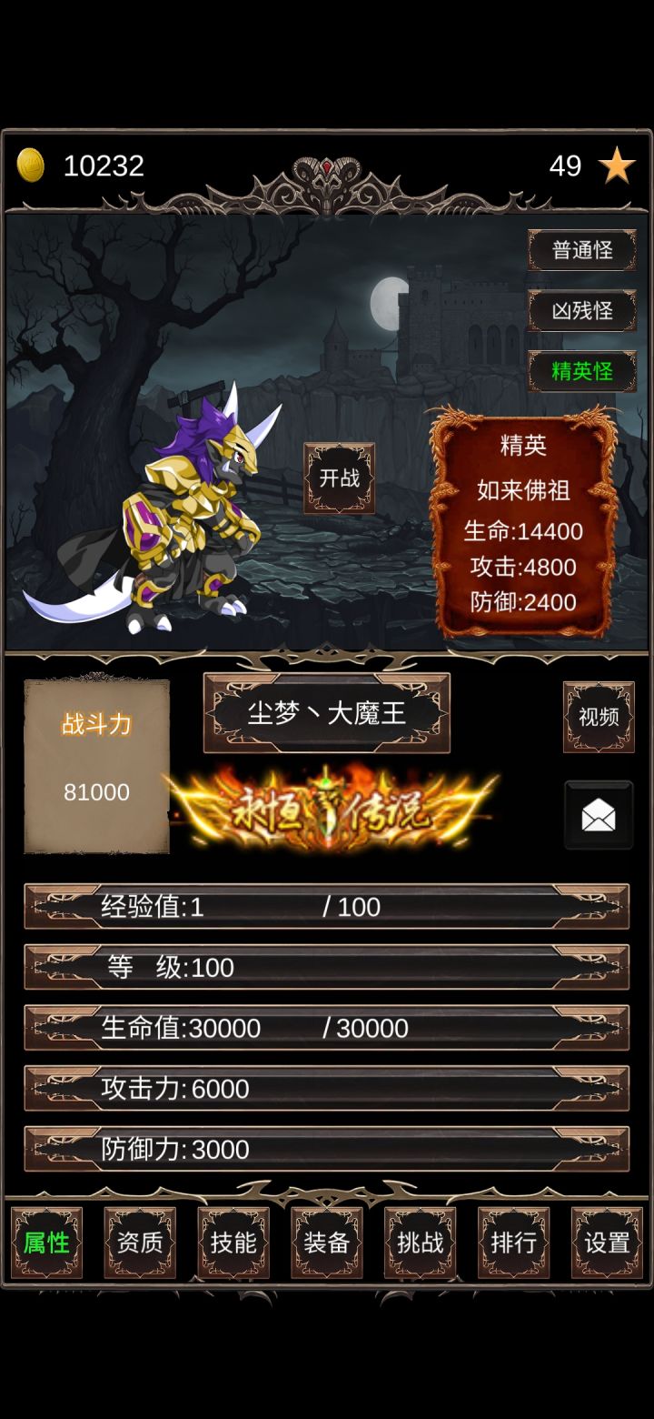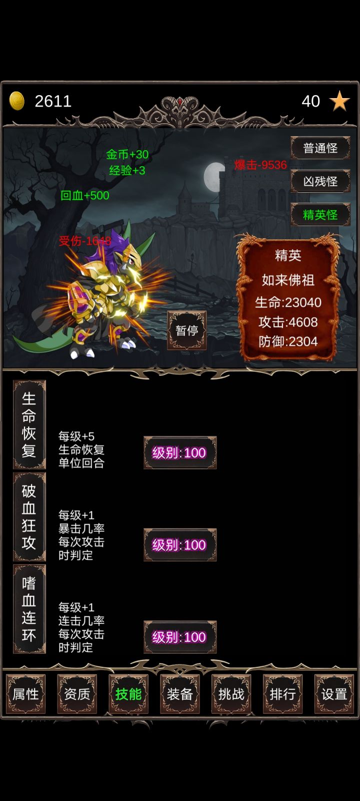 毕业留念,通关时间大概一个小时。第一次完了半个小时发现玩错了,卸载重装。进游戏可以打怪,但别升到2级,看点广告刷装备品质,用金币升几级,只要能打过1级精英就行。然后就是无脑挂机了,先升攻击秒怪,然后把连击升满,升级效率最大化。期间不要换怪不要挑战,怪物的属性就不会增长,刷到一百级,所有资质刷满,挑战boss通关。