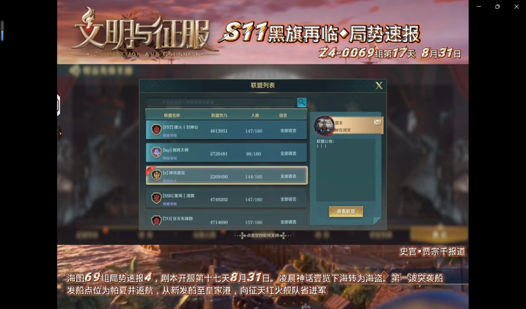 当前剧本已经进入尾声各大区帝都归属均已经确定除了少数区服仍存在较激烈的战争大部分区服都已经进入等待结算阶段整体局势趋于平缓 下面让我们一起来看看本期的局势速报吧史官@江南雨@我二弟天下无敌@执素兮@贾宗千 (左右滑动查看) Civilization and ConquestZ4-0065局势速报/01史官:江南雨情报截止时间:9月12日9点