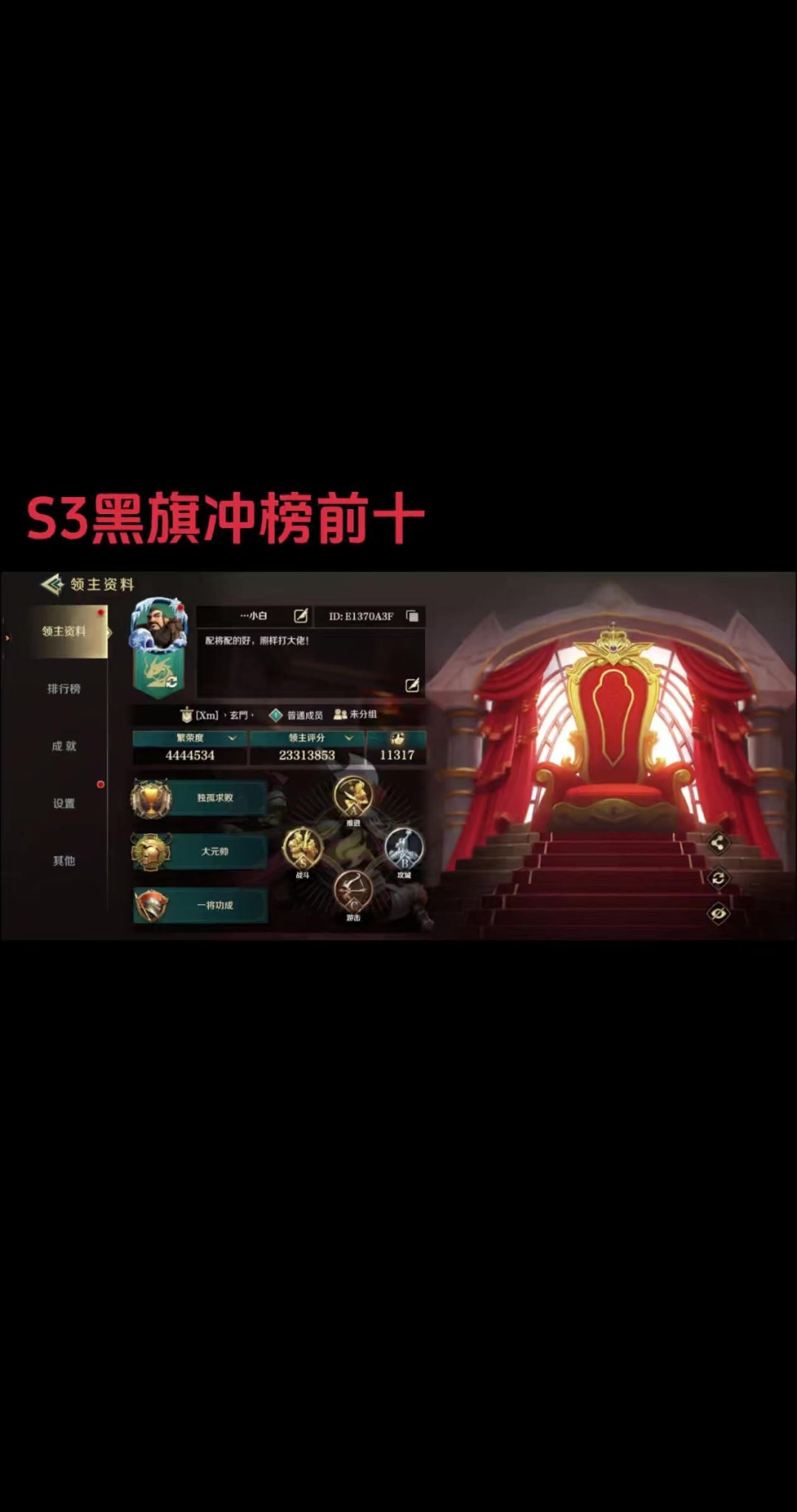 S3黑旗冲榜,老板要求前二十,打了两个前十。超额完成任务。老板很满意。#游戏种草计划#文明与征服庄子配将