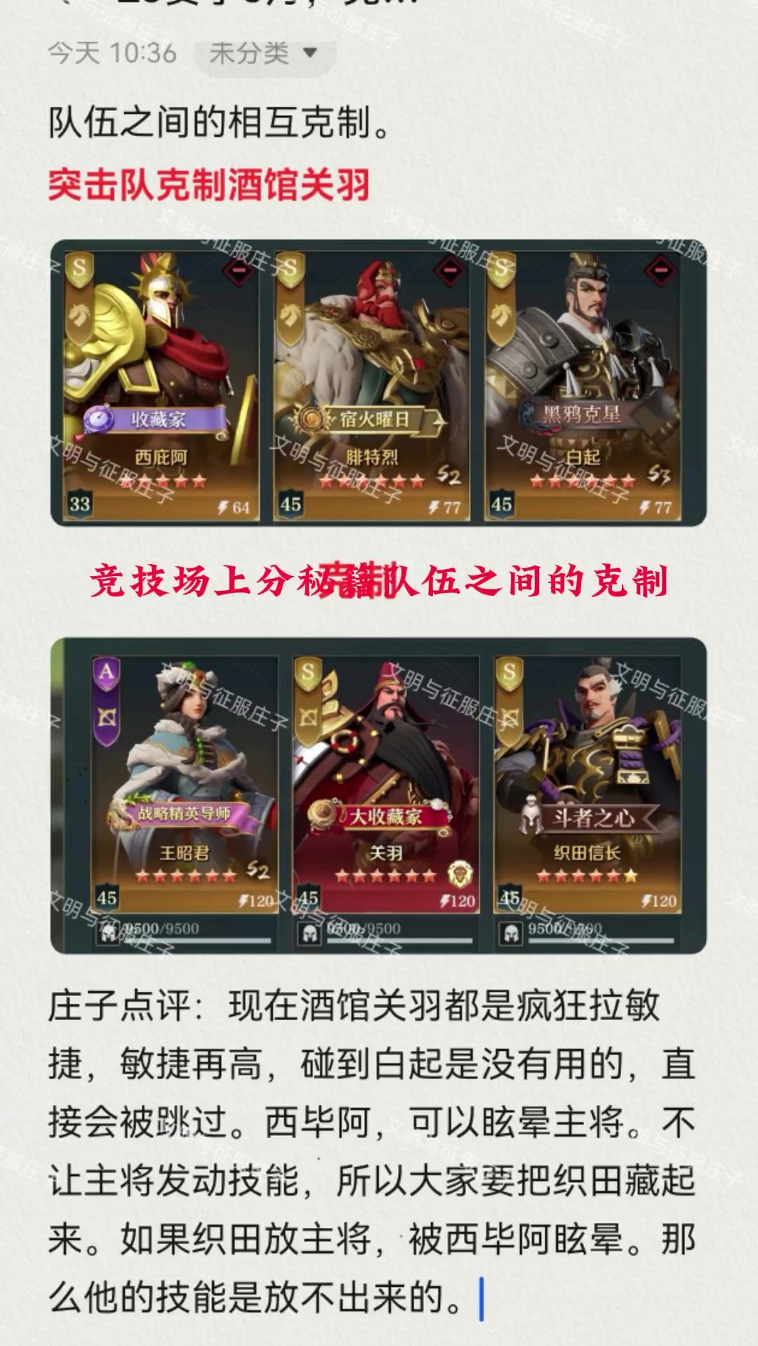 庄子干货,分享。队伍之间的相互克制,大家一定要学,学会竞技场可是上大分的。学会,自己配将的技术会有很高的提升。#游戏种草计划#文明与征服庄子配将
