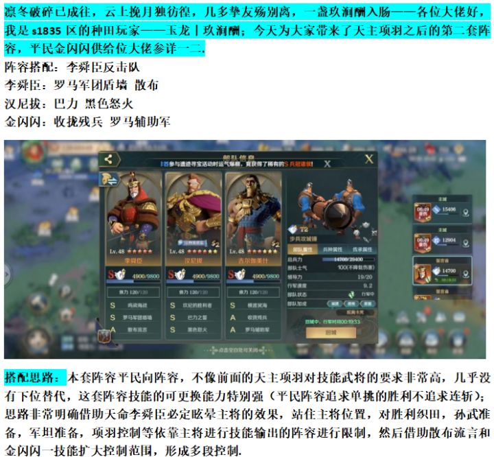 【战略学院】顾辞~关注抖音直播配将~抖音号:1685523385#文征共创第四季#提供有偿咨询配将服务~前言S4赛季的版本之子白起,不仅打破了原有突击队卷速度的格局,还成为了很多没有白起玩家的心里阴影。其跳过回合的能力,确实太折磨人了,速度比白起快,它将你跳过回合,没它快,就被它先手秒掉。所以对于这个情况顾辞也研究出一队可以克制白起队的阵容。阵容推荐|眩晕反击队战报解析面对白起队