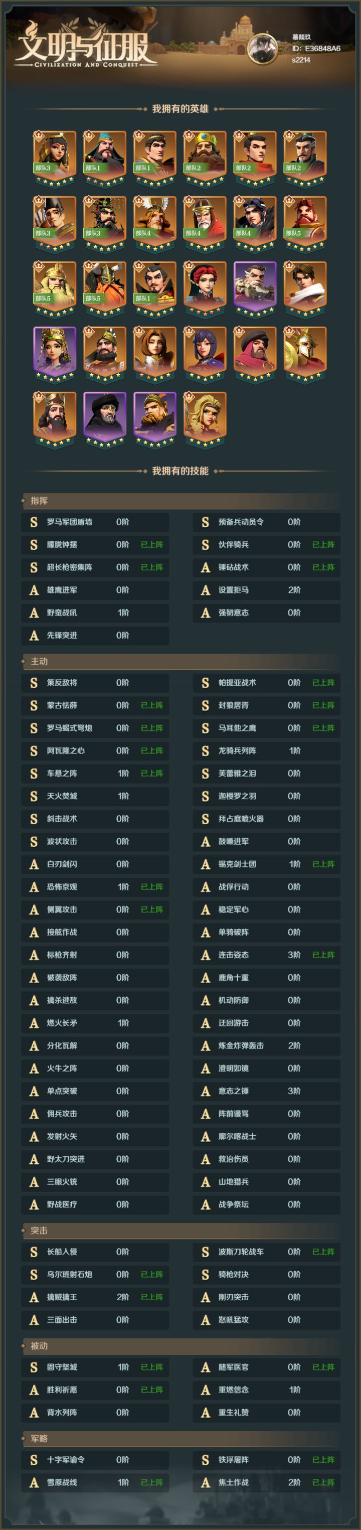 阵容推荐(3)S3-新平民爆头突01/前言突击队,随着S1至S3技能以及英雄的增加,队伍组合也随之变化。万变不离其宗,大多队伍凭借连击效果或者单体高伤击杀敌人;然而,随着游戏变化,爆头队随之诞生在玩家的视野中。他在短时间可以依靠自身速度,配合【楔型骑兵阵】从而在瞬间以高额伤害击杀对手。那么,今天就为大家推荐S3新爆头队吧。 02/阵容讲解此阵容由腓特烈,萨拉丁,王昭君所组成。此外,此展示阵容并