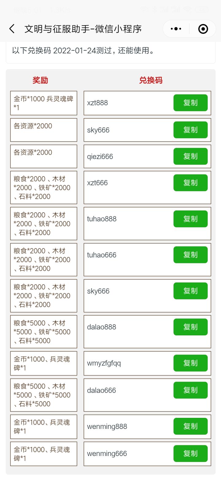 这里挺多的有16个礼包码😁 点进去复制就行,不用谢。来源: 文明征服助手(微信小程序)
