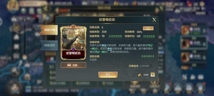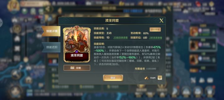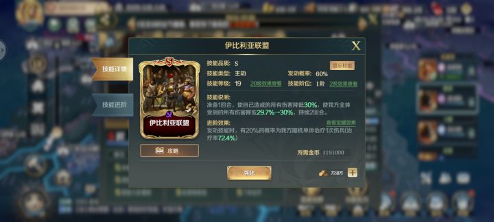 普鲁士,如果本回合没有发动主动技能,提高下一回合技能发动概率20%,同时准备技能有80%增加60力量。作为一个辅助技能,大大的提高了,关羽的技能发动概率。