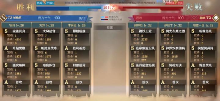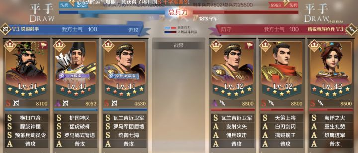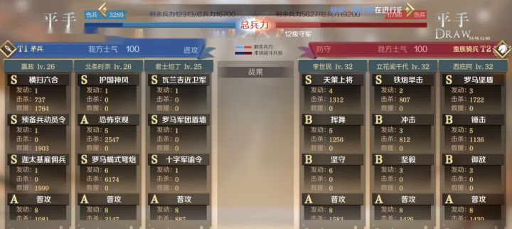 战报组成:准备回合,冲锋,及其后面的8回合,8回合无主将死亡视为平手 出手速度: 殊死一搏> 迅捷 > 敏捷 一回合: 角色行动到下一次这个角色行动 为一回合,例如凯撒给队友施加了抵御,持续一回合,如果没有人打破,会持续到凯撒下一次行动才会消失。 技能释放顺序: 被动-军略-指挥-主动-普攻-突击 同类型技能释放顺序:由英雄技能栏第一,第二,第三顺位释放 技能特效控制类: 缴械(无法普