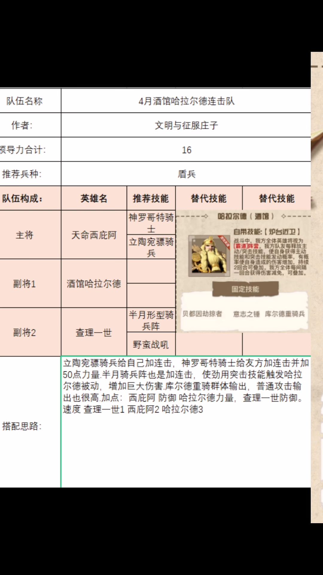 【战略学院】顾辞~关注抖音直播配将~抖音号:1685523385#文明与征服星陨之地#提供有偿咨询配将服务~一、技能解读骑兵冲锋 该技能野外作战能力,非常得强力只要运用得当,几乎可以在野战的时候做到零战损击溃两队敌军,尤其是在敌军扎堆堵路的情况下,其效果更加的明显,可以用少数的骑兵,冲溃敌军的堵路团,不过需要注意的就是,冲锋前一定要注意把控冲锋距离和调整冲锋方向,不然超出冲锋时间后,
