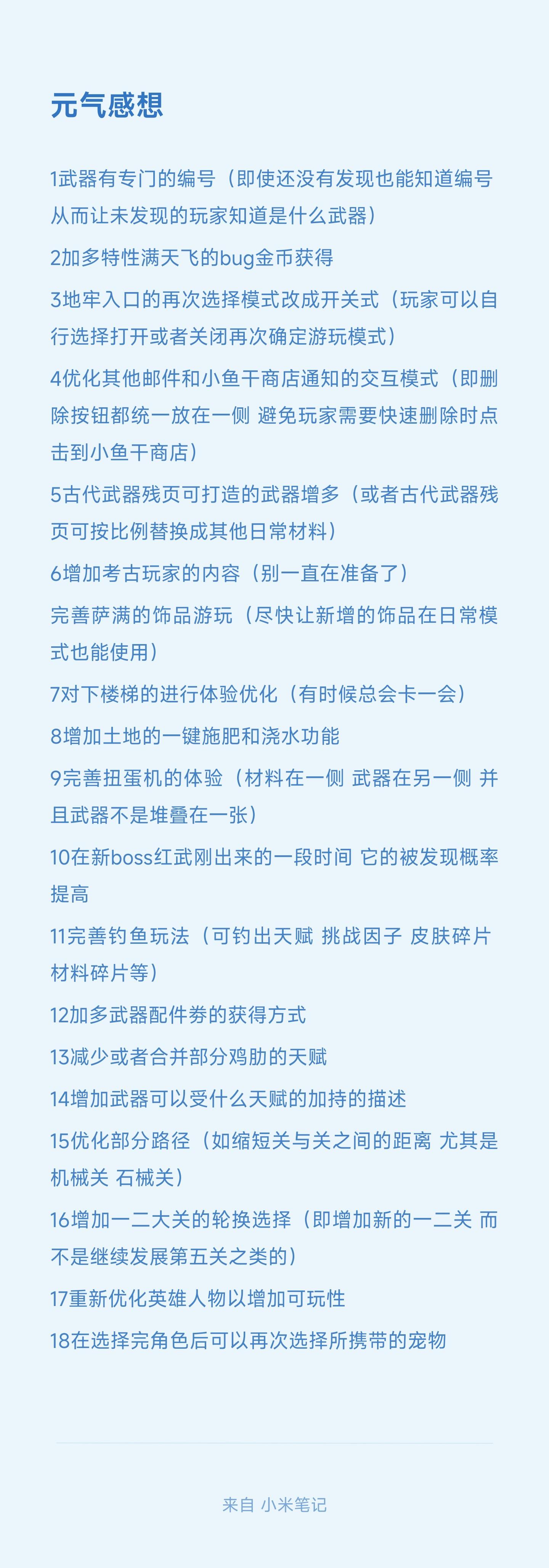 元气感想1武器有专门的编号(即使还没有发现也能知道编号 从而让未发现的玩家知道是什么武器)2加多特性满天飞的bug金币获得3地牢入口的再次选择模式改成开关式(玩家可以自行选择打开或者关闭再次确定游玩模式)4优化其他邮件和小鱼干商店通知的交互模式(即删除按钮都统一放在一侧 避免玩家需要快速删除时点击到小鱼干商店)5古代武器残页可打造的武器增多(或者古代武器残页可按比例替换成其他日常材料)6