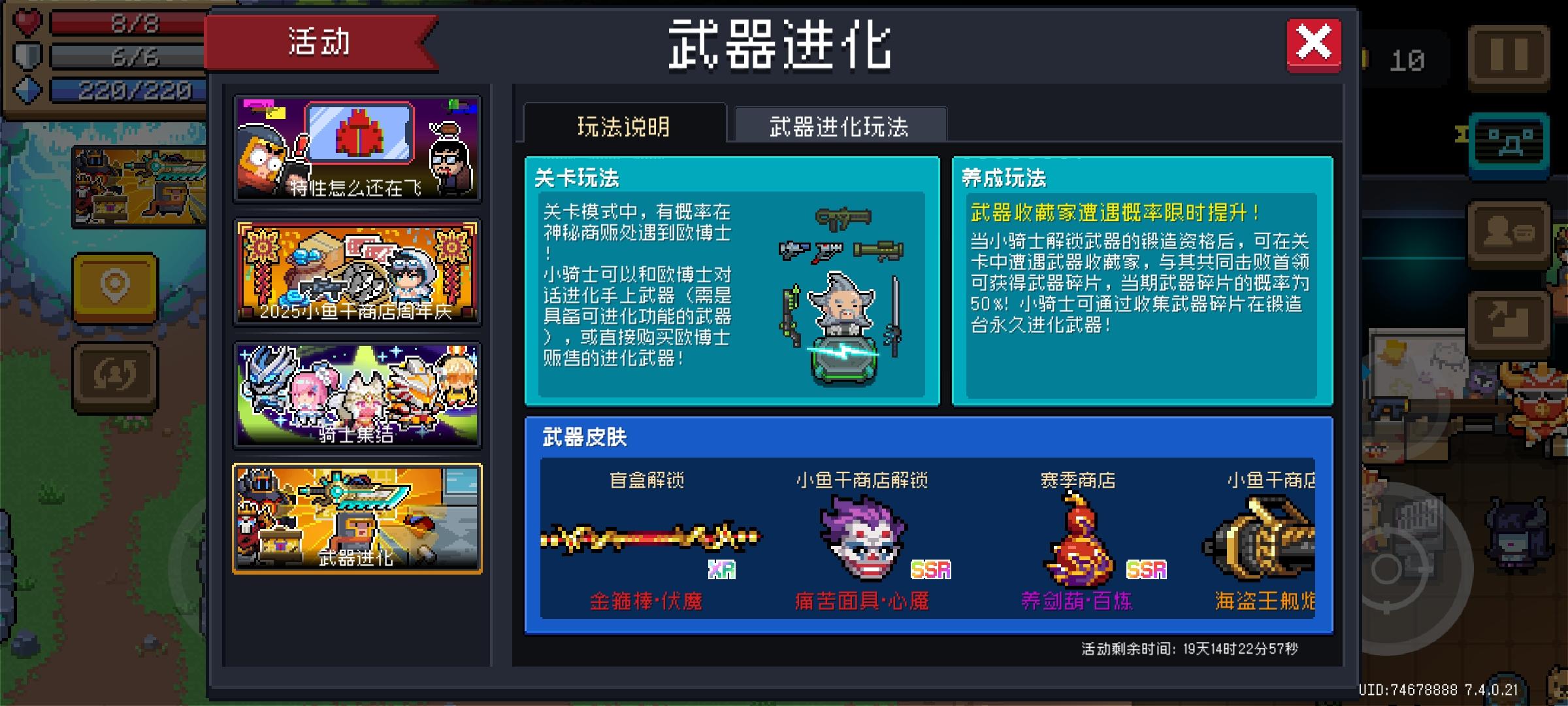 图一我的冥王长刃怎么分身手里成刺客初武了?图二这个养剑葫咋把我皮三的起跳扣了?图三纯吐槽,你好像是有一个叫做“不能锻造的武器不能获取进化图纸”的设定对吧,我请问这个设定除了给你增加日活对玩家有任何好处吗?你要么把这个设定删了要么你来一个“能在地牢里正常获取且并未解锁可锻造武器遇见概率大幅提升”,我也不管你的文字游戏(就像这个武器收藏家的概率一样模糊随便改),起码得有一个应付玩家的态度吧?你这打