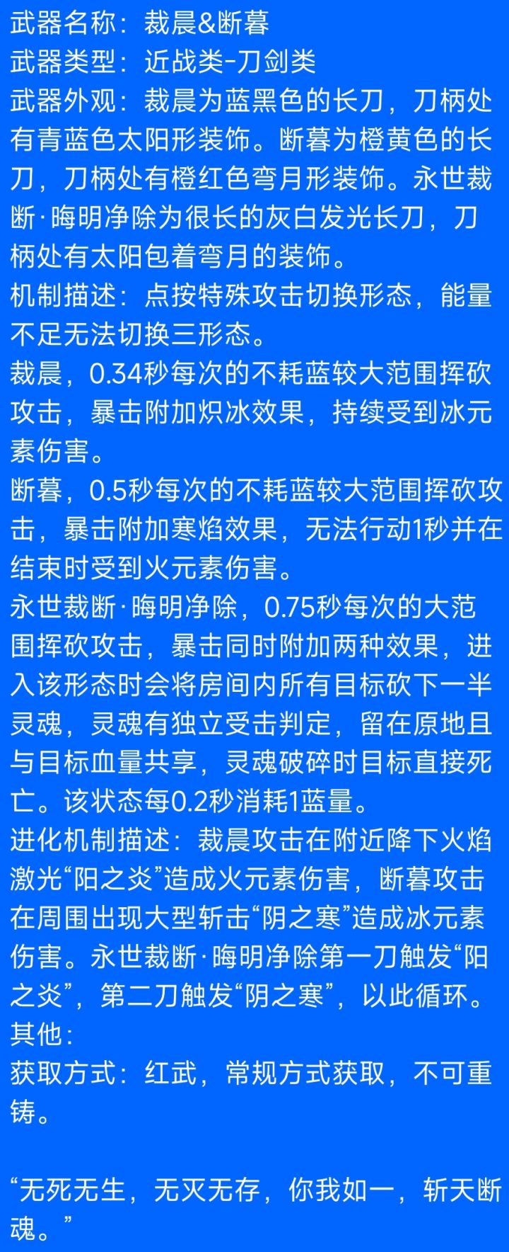 武器名称:裁晨&断暮武器类型:近战类-刀剑类武器外观:裁晨为蓝黑色的长刀,刀柄处有青蓝色太阳形装饰。断暮为橙黄色的长刀,刀柄处有橙红色弯月形装饰。永世裁断·晦明净除为很长的灰白发光长刀,刀柄处有太阳包着弯月的装饰。机制描述:点按特殊攻击切换形态,能量不足无法切换三形态。裁晨,0.34秒每次的不耗蓝较大范围挥砍攻击,暴击附加炽冰效果,持续受到冰元素伤害。断暮,0.5秒每次的不耗蓝较大范围挥