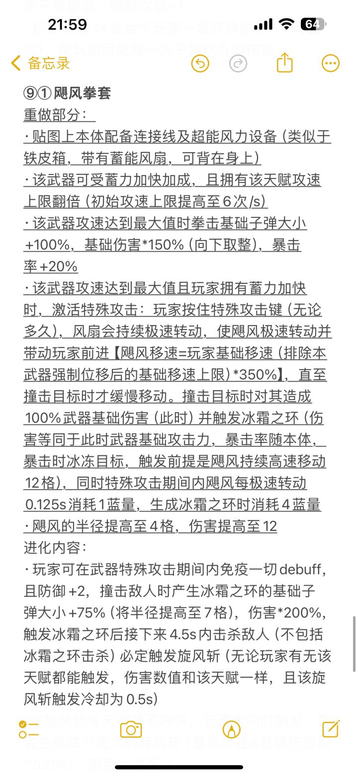 [武器创意征集]+taptap+斩月武器名称:斩月武器类型:近战类武器外观:正常形态是一把普通的大刀,进化形态是一把刀柄是个卐字的漆黑的长刀武器机制:攻击力12,能量消耗2,暴击率15,偏移0;向前挥出4格范围的斩击,每三次攻击会进行大范围回旋斩击并对敌人造成眩晕。每当暴击时都会获得“战意”(战意会使自身攻击速度、移动速度获得一定提升,并且受到致命伤害时可以消耗战意抵挡。)进化机制:每当