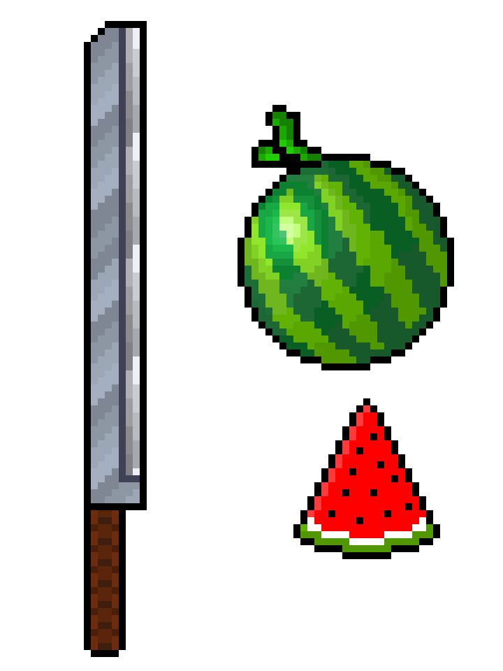 --武器名称:西瓜刀 --武器类型:近战类 --武器外观:如图 --机制描述: 攻击力8 能量消耗2 暴击率0 偏移5 每秒挥砍3次,每次攻击消耗2点能量向敌人投掷3枚西瓜片,并有30%几率额外投掷一个大西瓜(你这瓜保熟吗?),西瓜片造成3点伤害并对敌人施加西瓜片效果(头上出现西瓜片),大西瓜造成10点伤害并对敌人造成2秒眩晕然后分裂出3枚西瓜片,西瓜片效果可以叠加至5层,叠满后西瓜片自