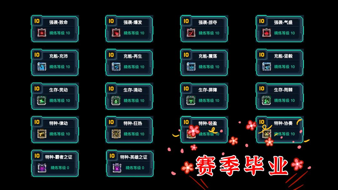 测试版本:4.3.7 强袭-致命/爆发/掠夺/气盛 生存-灵动/涌动/屏障/荆棘 充能-充沛/再生/震荡/坚毅 特种-律动/狂热/轻盈/协奏/英雄之证/霸者之证
