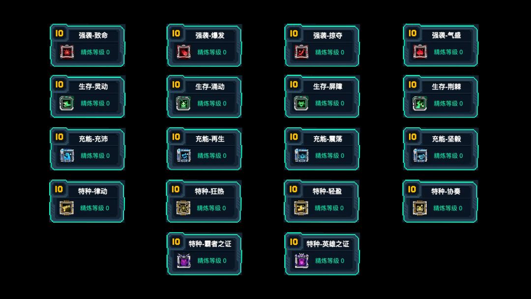 测试版本:4.2.6 强袭-致命/爆发/掠夺/气盛 生存-灵动/涌动/屏障/荆棘 充能-充沛/再生/震荡/坚毅 特种-律动/狂热/轻盈/协奏/英雄之证/霸者之证