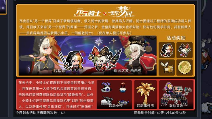 普通关卡速通四层,120活动币dzt关卡加怪物增多因子,142活动币两次关卡都只遇到过一次活动雕像也就是说普通和dzt就是一个奖励结算至于多出来的活动币应该是打破活动奖励怪物数量,从而多出来的一点点直接普通速通,没必要给自己添堵成功兑换角色后,可以使用这个活动角色,感叹关卡多为黄金树,可以更加快速地获取活动币#元气骑士