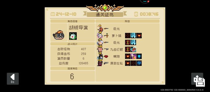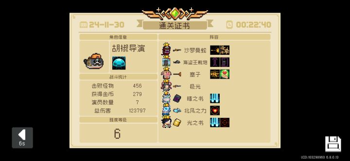 #元气骑士 胡椒导演搭配这些演员,难度六满血过阵容又➕1。总所周知难度六前期小怪自带炸弹会爆炸造成伤害,中期子弹密集,后期黑心制作人更是子弹多到不能行。导演提供护盾能够保护演员扛伤,后期璀璨文明阵容提供文明遗产保证钱款,加上璀璨文明必出阵容演员之一,很容易刷出三星演员。配上合理的武器以及技能,技能推荐激光雨,武器推荐光之书,能够全屏aoe。运气好凑一个大哥大,虽然我没凑出来,但是两个大哥大是有概率