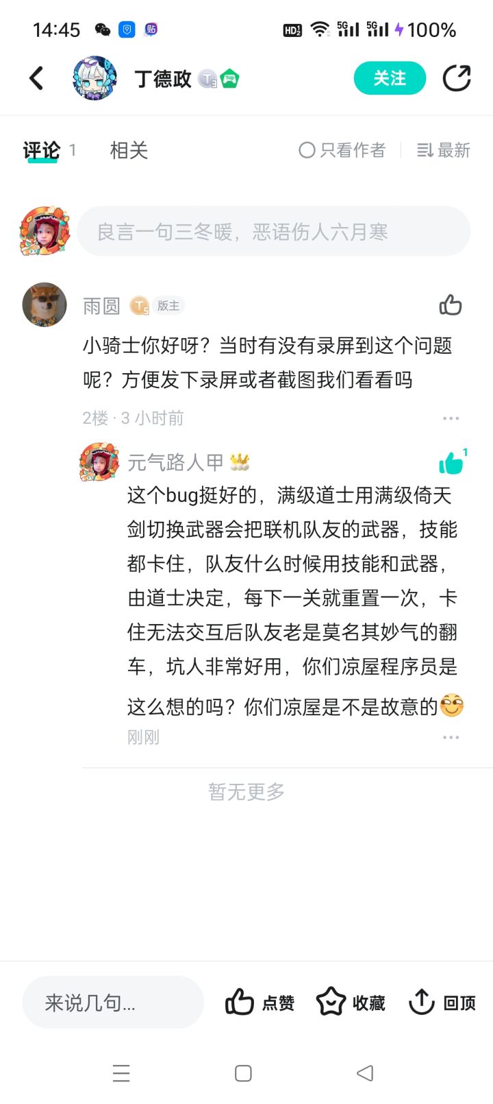 队友武器无法切换,技能无法使用,宝箱无法交互,比如机器人交互完毕,道士使用倚天切换以后,地上的种子捡不起来。联机记得踢,不然你就等着被坑死吧