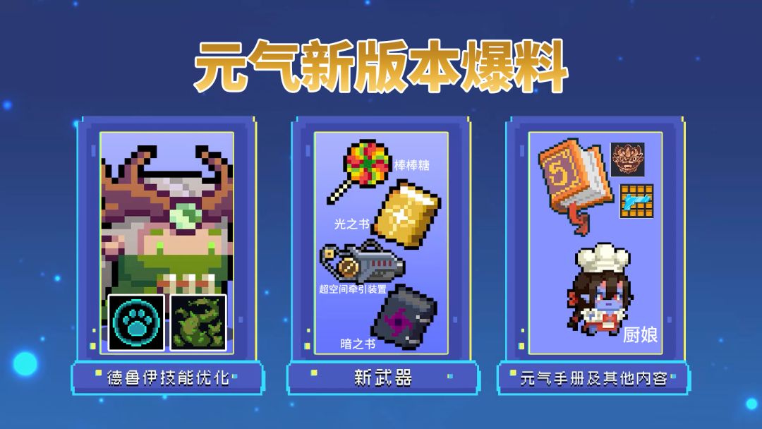 4把新武器:超空间牵引装置/棒棒糖/光之书/暗之书 德鲁伊一技能:【霜烬狼袭】 二技能:【剧毒藤蔓】 新增NPC厨娘:随机获得一种挑战因子#宝藏游戏安利派对#元气骑士#攻略#游戏安利#游戏推荐