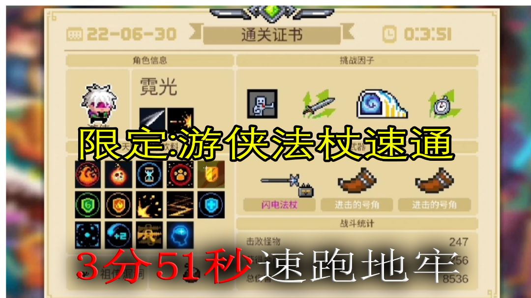 本期展示本次限定速通赛的第一名素材,小伙伴选择的是闪电加双号角的组合,不得不说双号角秒boss就是快,如果他运气不好,没有三持的话,还能稳坐第一名吗?