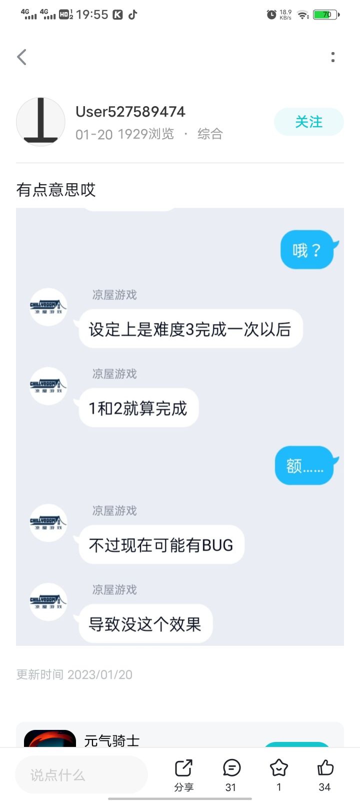 但也不至于这么一个bug会被玩家反馈了到现在为止19天仍旧不闻不问,这还没考虑那个玩家是不是当天反馈当天发的,如果不是那更久了,难道这个bug不值得凉屋多费心思吗?它不重要吗,因为这个bug有多少玩家被逼着多肝了三把1七把2,这些难道都不足以引起凉屋的重视吗?不利于玩家体验却不影响凉屋赚钱的“小”bug对于凉屋来讲就那么不重要吗?就那么不值一提吗?